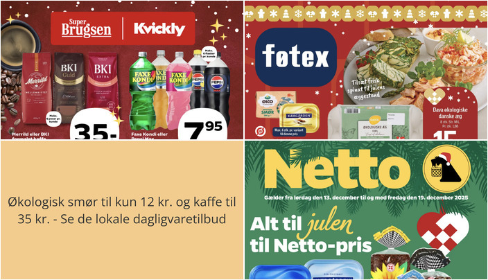 SuperBrugsen tilbyder Merrild eller BKI formalet kaffe i flere varianter (350-400 g) til kun 35 kr. pr. pose. Der er en begrænsning på 6 poser pr. kunde. Tilbuddene gælder fra fredag den 12. december til torsdag den 18. december.