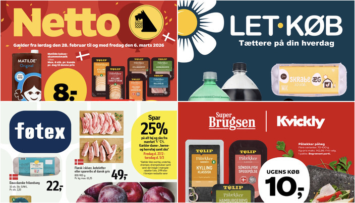 SuperBrugsen og Kvickly tilbyder Tulip pålæg i flere varianter til kun 10 kr. pr. pakke. Vægten varierer mellem 70-100 g. Tilbuddet gælder fra fredag den 27. februar til og med torsdag den 5. marts.